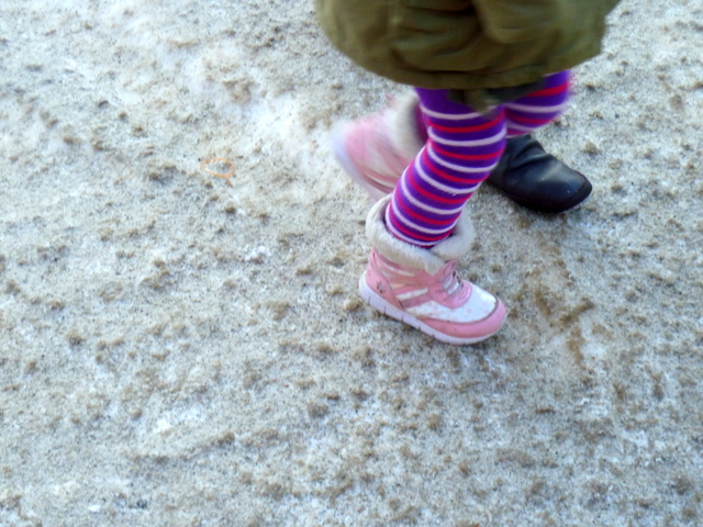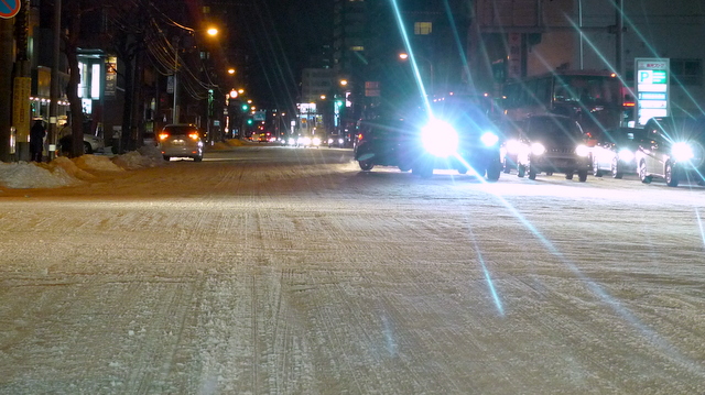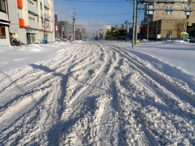 注意しても転倒しやすい"サラサラ雪の下の凍った路面↑"