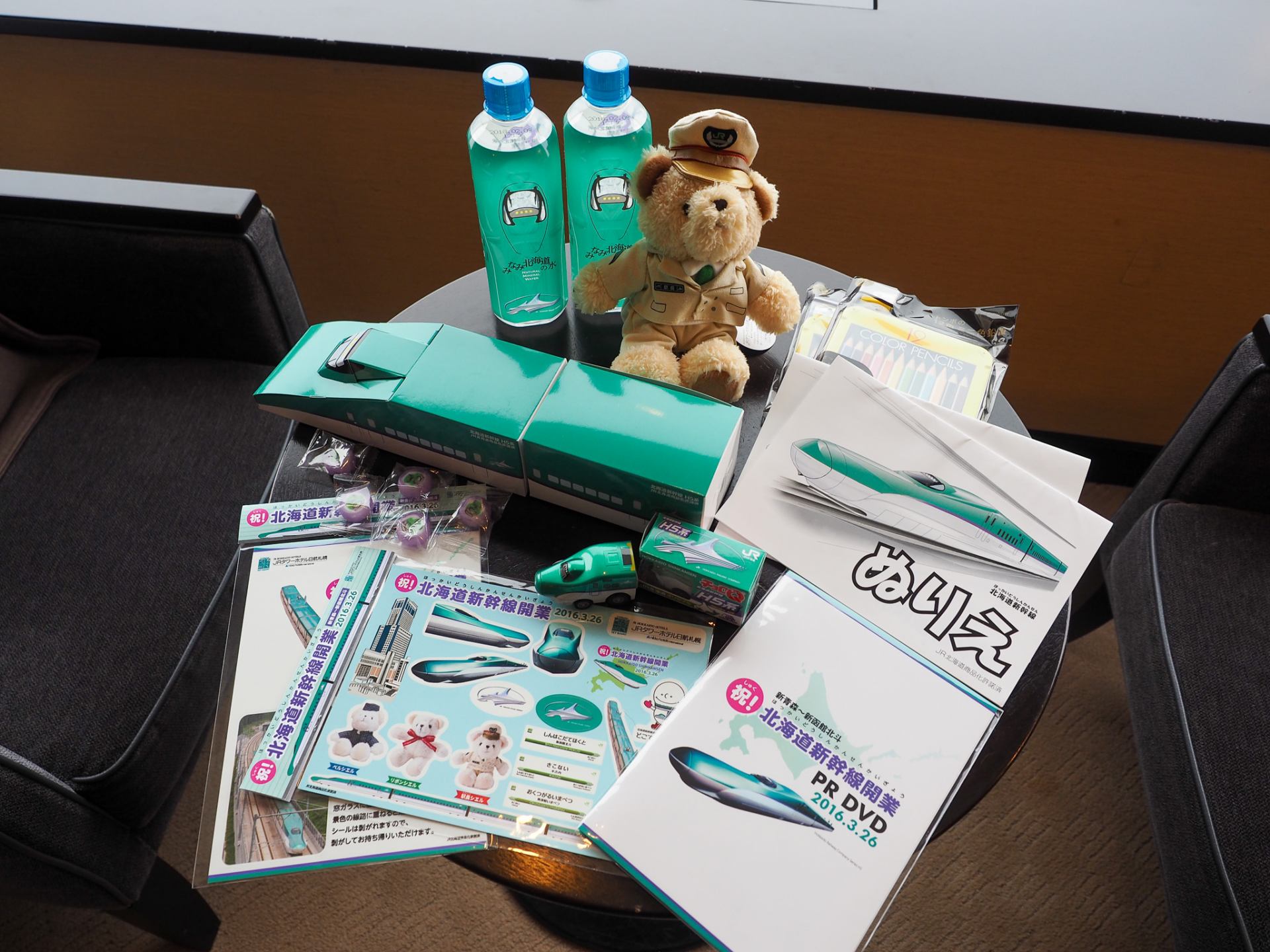 札幌駅長の制服を着たホテルオリジナルマスコット「シエル」をはじめ、北海道新幹線H5系チョロQ、ぬり絵セット、金太郎飴などなど。