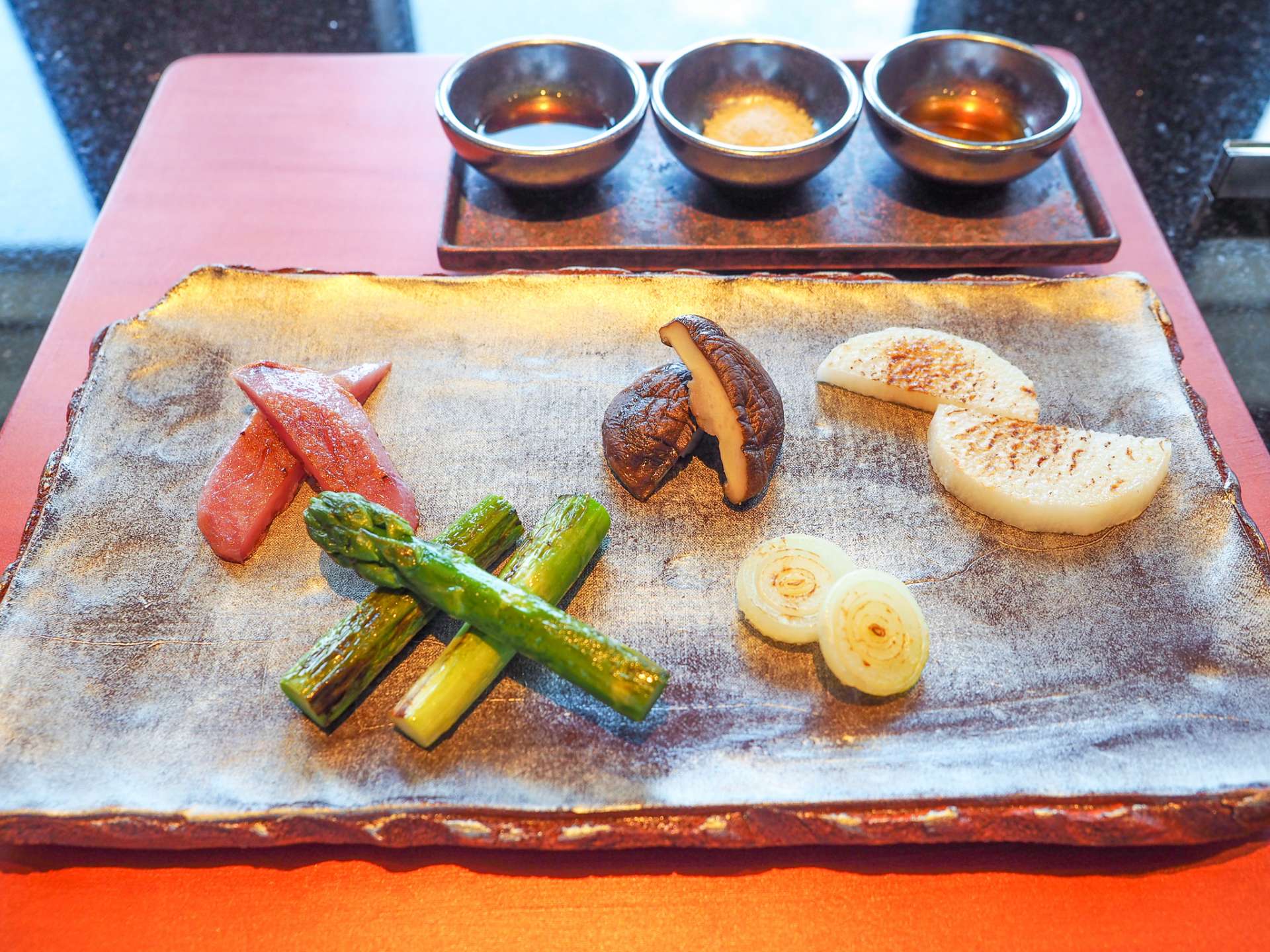 十勝の無添加たまり醤油・ポン酢・熊石町産の藻塩をお好みでつけていただきます。