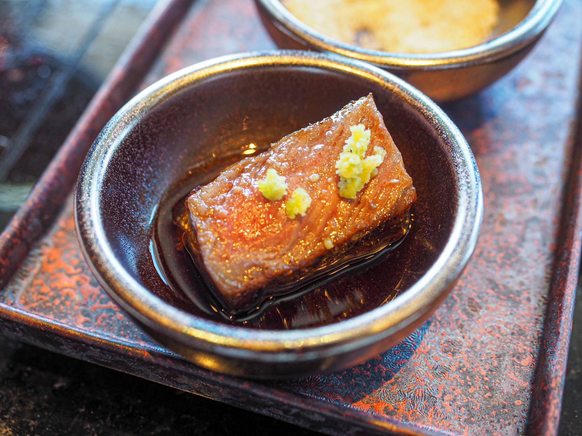 わさび・醤油・荒びき黒胡椒・にんにくチップをお好みで一緒にいただきます。