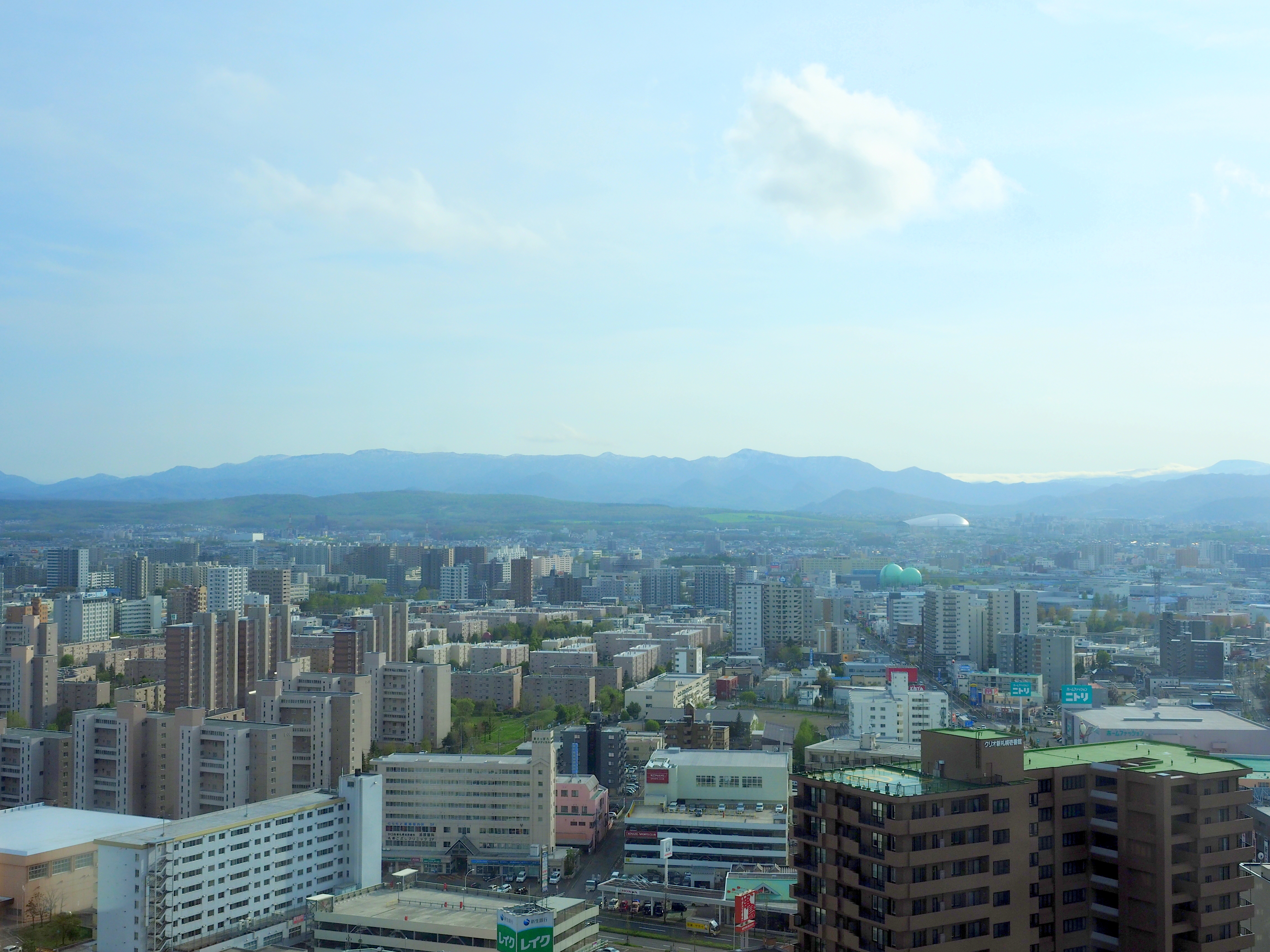 右側に白く見える札幌ドームとその後方には、札幌の南から西に連なる山々が見えています。