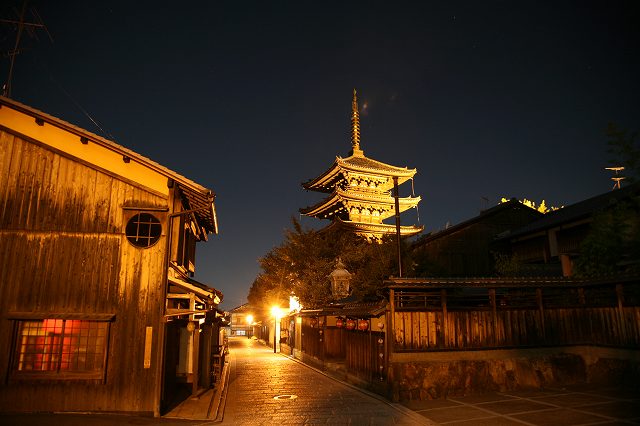 通りを進んで、ライトに浮かぶ八坂の塔。