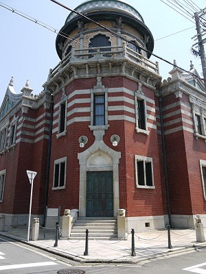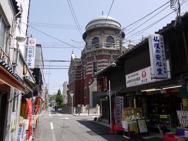 仏具屋さんの向こうに建つのは、ドームが象徴的な西本願寺伝道院。
