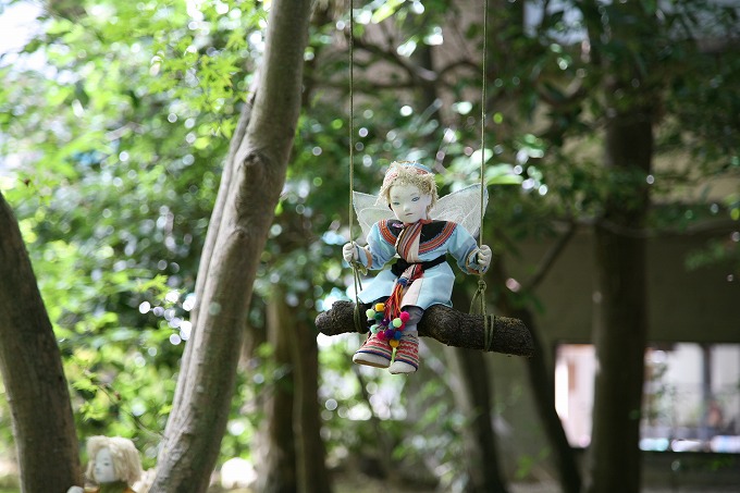 カフェの木々から、お人形さんが迎えてくれました。