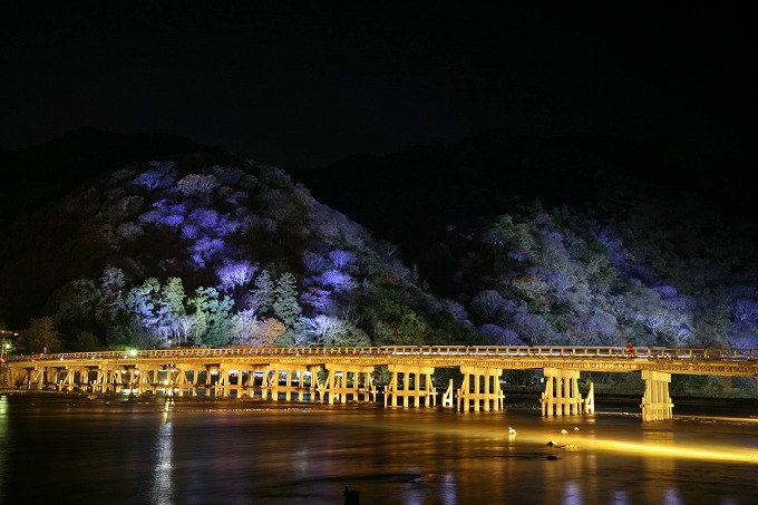 幻想的な光に、嵐山と渡月橋が浮かび上がっています。