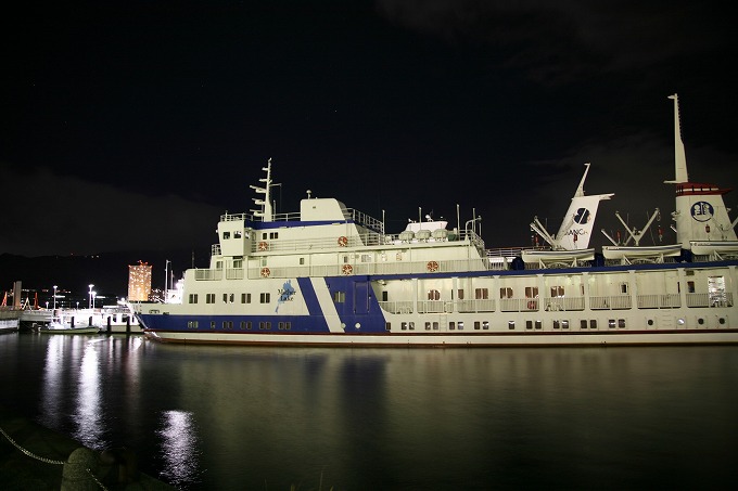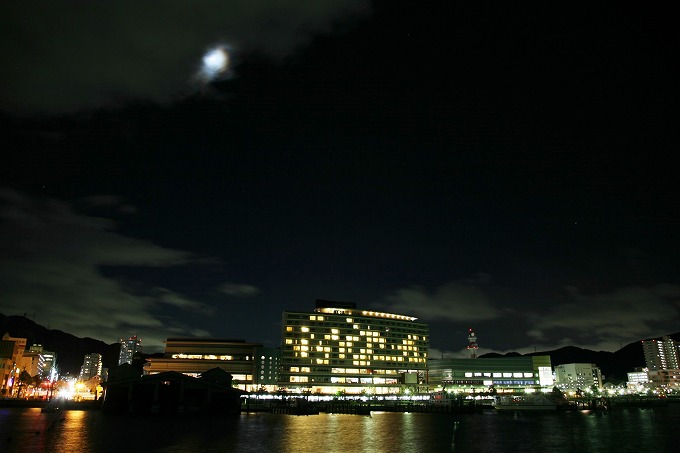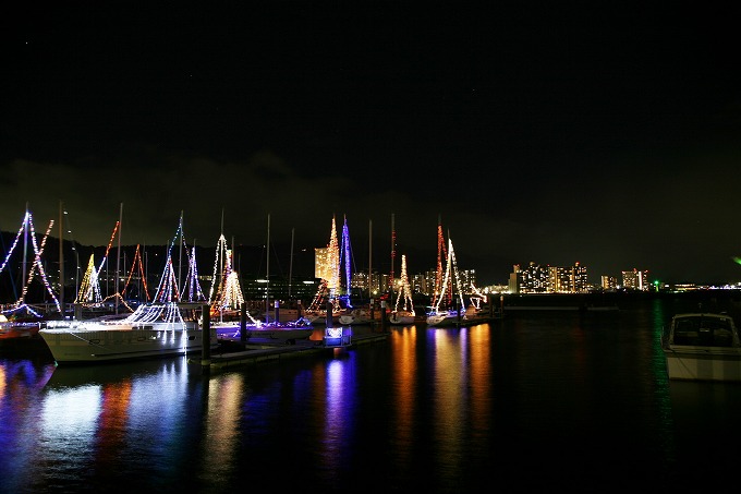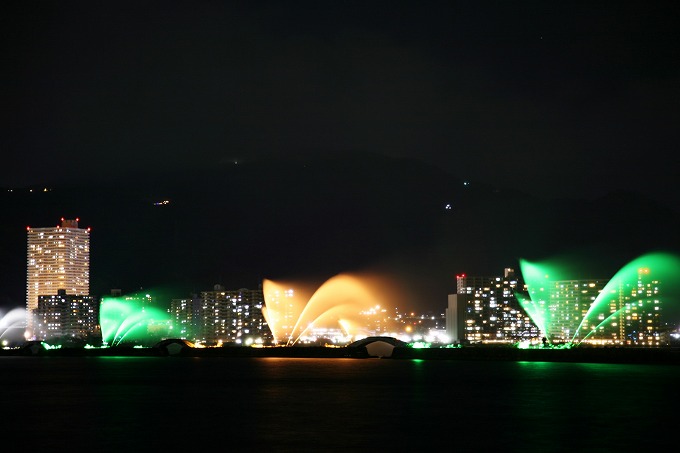 12月の今、湖面に灯るヨットのイルミネーションと花噴水の夜景は、