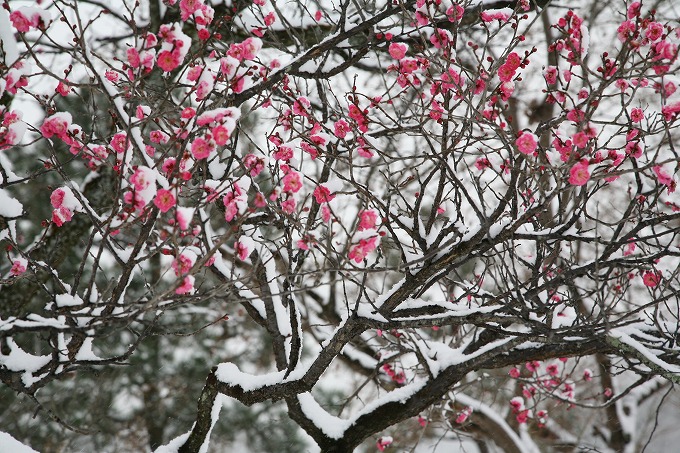 暖冬で、早く咲いた梅の花も雪化粧です。