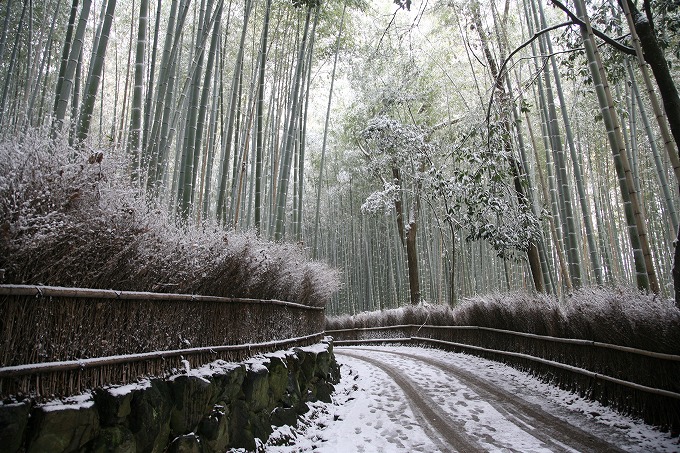 雪の朝、嵐山から竹林の小路の風景でした。