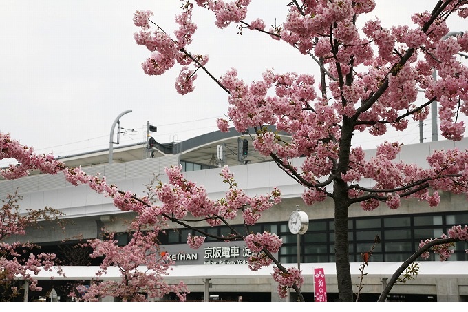 ここでは、京阪電車淀駅前にも河津桜が咲いています。