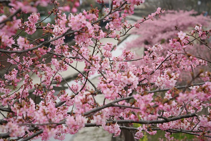 淀水路には遊歩道があり、川沿いに多くの河津桜が植えられています。