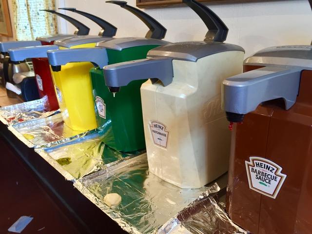 ケチャップ、マスタード、ラリッシュ、マヨネーズ、バーベキューソース完備。