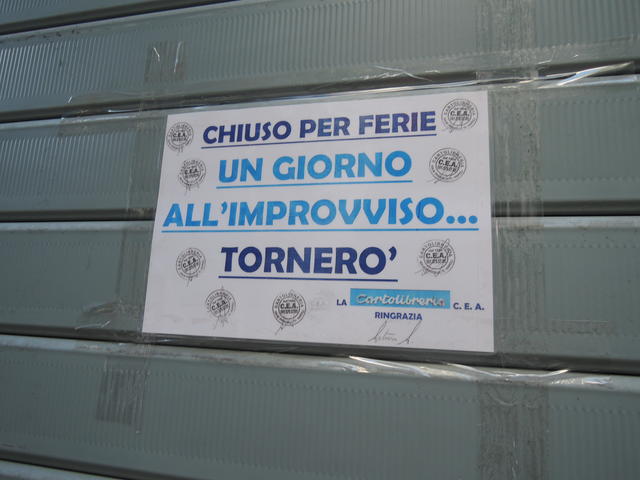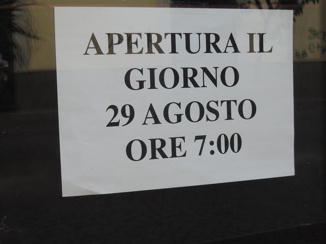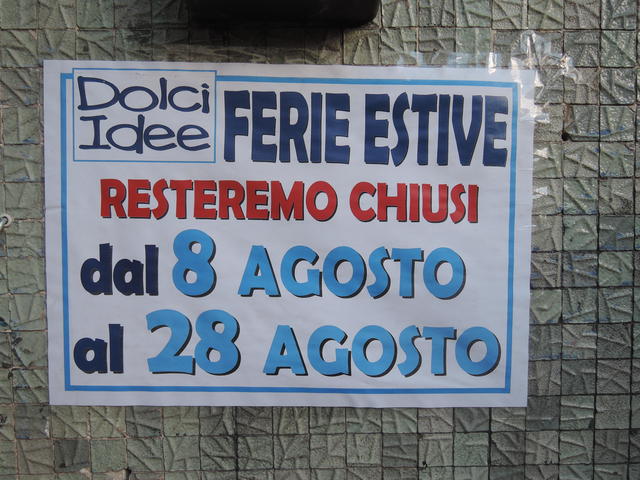イタリアのこの時期はレストランを初め、お店、薬局、キヨスクなどがお休みになります。少なくても2週間、長くて1か月の休暇を取る場合もありますので、ご注意下さい。
