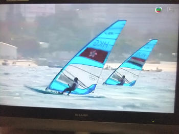 では、テレビ中継はどうなっているかと言いますと、無線電視(TVB)というテレビ局が独占放送をしています。当然と言えば当然ですが、人気種目であったり、メダル獲得の可能性が高いものだったりするのが放送されます。ですから、日本とは放送されるプログラムが全く違います。下記の写真のセーリング、自転車、卓球などが放送されます。また、中国が強い種目も放送されます。