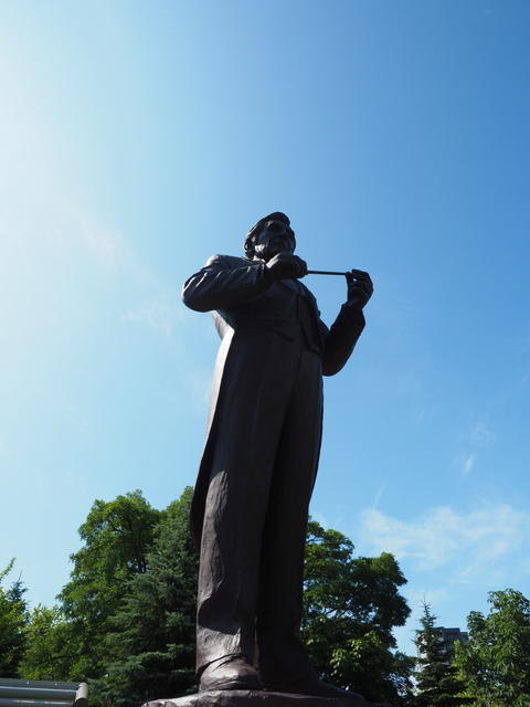 朝日を浴びる指揮者レナード・バーンスタインの像。