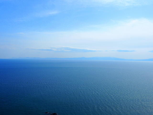 地球岬から太平洋を臨むと、写真では「水平」線ですが、
