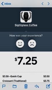 もし、その時初めてのスクエア体験ならレシートの送りようがないのでメールアドレスを登録する事になり、その場で自分で指タッチで登録。 完了と同時にレシートが送られてくる。 しばらく待っても(目安は5分)レシートが来ない場合メールアドレス間違っているので、面倒でも入力し直しをお勧め。 一回登録すればいいだけなので面倒くさがらずやっておこう。 ニコちゃんマークは対応の評価をするアンケートだけど、よほど印象に残らなければ、まぁいつもほっとく。
