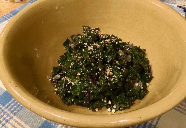 タヒニは生ゴマ練って作ってる練りゴマ酵素は生きたまんま。 スーパーシードはチアシードをはじめ7種類のいわゆるスーパーシードが一袋に入っている。(お土産にすごくいいですよ!)そして言わずと知れたスーパー緑黄色野菜のケールを使ってせっかくなのでスーパーな一品を紹介 ^ ^