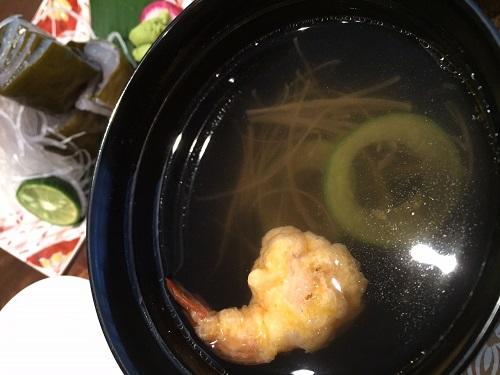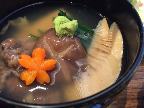 お吸い物、こちらはあごだしを存分に楽しめる一品。一口で幸せいっぱいになります、ため息~