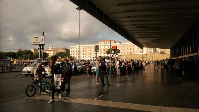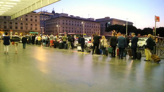 ↑ こちらがテルミニ駅五百人広場のタクシー乗り場です。”TAXI”と言うオレンジ色の看板が立っているところを先頭に人が並んで行きます。