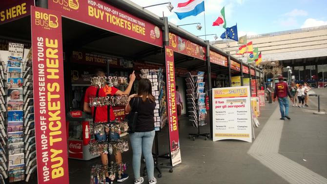↑ 五百人広場のテルミニ駅に向かって左側には、売店と二階建て観光バスなどのチケット売り場があります。ローマには二階建て観光バスの会社は数社あります。(例:1枚目の写真に2台見える臙脂色のバスなど)