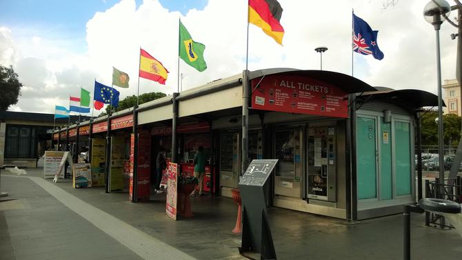 ↑ 売り場の中には、テルミニ駅-空港間のシャトルバスの切符を売る会社も入っています。エアポートシャトルバスサービスを行う大手にはTerravisionという会社があり、こちらのオフィスはここから歩いて3分位のテルミニ駅の建物の中(マルサラ通り側)にあります。レオナルド・ダ・ヴィンチ国際空港(フィウミチーノ空港)とテルミニ駅を片道4ユーロで結ぶ激安会社ですが、個人的にはお奨めしません。主な理由は、残念ですが、サービスの悪さです。