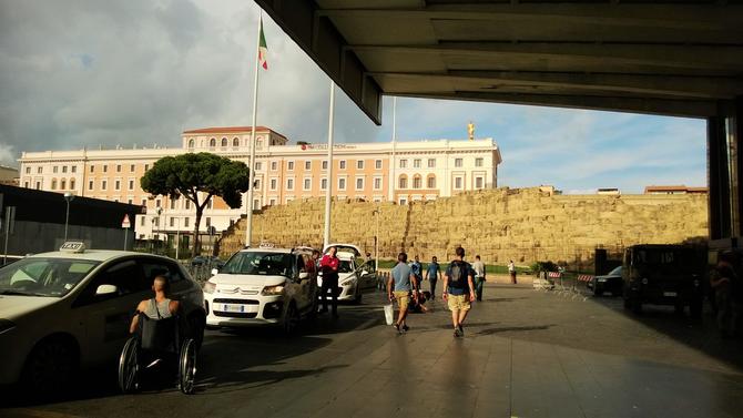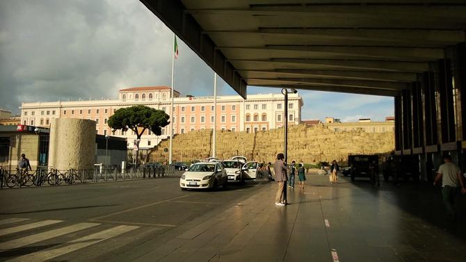 ↑ 謎の壁が見えています。この駅正面のすぐ脇(東側)にある壁はセルウィウス城壁と言い、紀元前6世紀にローマの町を取り囲んでいた敵の侵入を防ぐ為の防御用の壁の一部です。(この部分の壁は厳密には前4世紀に改修されたもの)