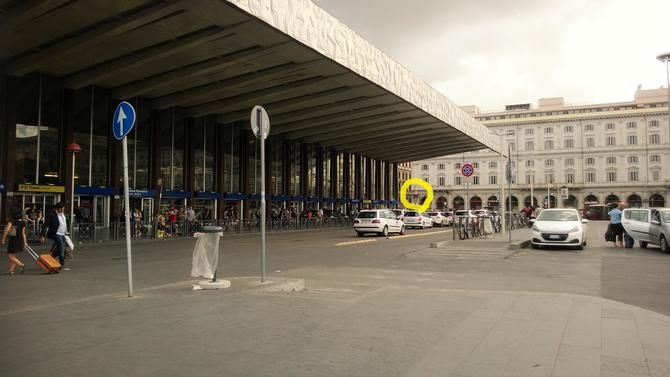 ↑ こちらがテルミニ駅正面のタクシー乗り場です。写真上で黄色の丸がしてあるところに、タクシー乗り場の”TAXI”というオレンジ色の看板が出ています。4~5台、縦に乗り場に並んでいるタクシーが見えます。