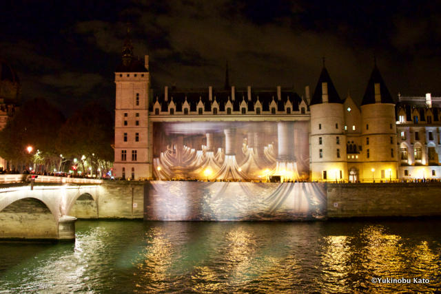 日没後からはニュイ・ブランシュが開始。セーヌ川沿いの道路などは、多くの人で溢れました。パリ市庁舎前広場にはStéphane Thidetのアートワークが、セーヌ川を挟んだシテ島側コンシェルジュリー前にはPierre Delavieの作品が掛かります。市庁舎からほど近いポンピドゥーセンターでは、ビートルズのアルバムジャケットで有名なアビーロードの横断歩道を、Les Nivauxが表現しました。
