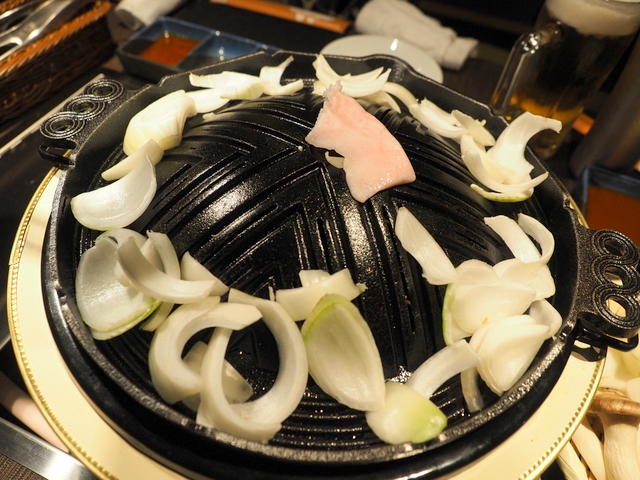 見た目にも美しい肉を正統派ジンギスカン鍋で焼きますが、