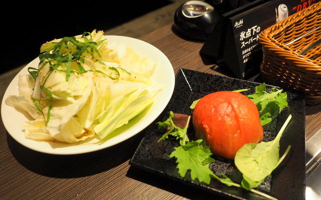 “Side dishes: Fresh cabbage seasoned with salt and Japanese basil/Cold tomato with sweet vinegar”