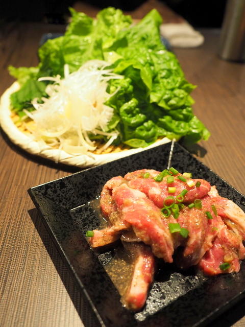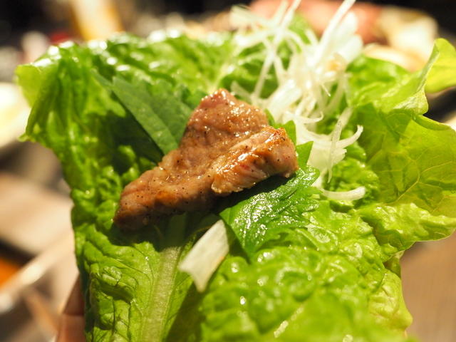 自家製塩だれで揉み込んだラムをサンチュで包み、