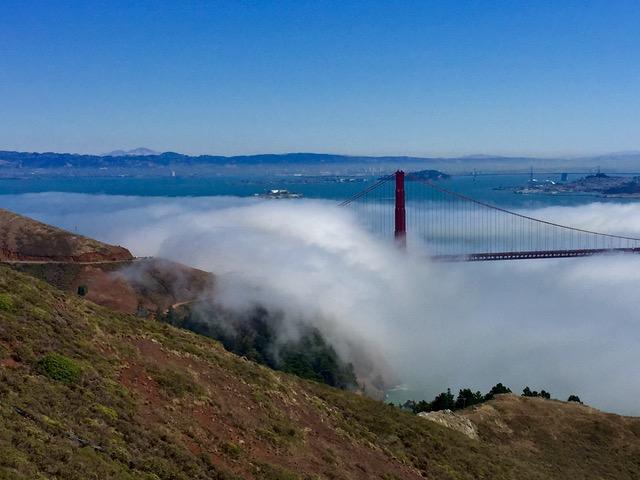 完全にマリーンカウンティ側の主塔に見えた! びっくりな青空になるまで5分足らずの変化。 数日間の天気の具合で霧の通り道となるゴールデンゲート周辺の面白い風景を見ることができる。