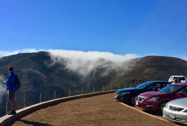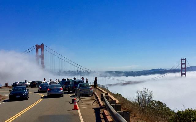 やや渋滞気味、でも動く霧の景色をカメラやビデオに収めたい気持ちよ〜く分かります。 しかしこの青空でもウィンドブレーカーを着ている人が多い。 そう風を遮る上着は重宝するのがサンフランシスコ。