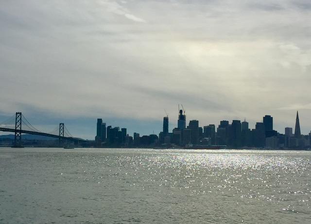 右側に三角のトランスアメリカピラミッド、中央に万歳しているようなクレーンがあるビルがセールスフォースタワーだ。(気温17℃)風がないので半袖で十分。