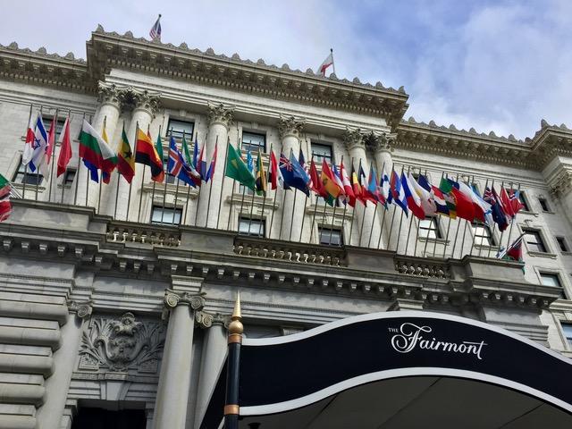 昼頃、ノブヒルのフェアモントホテルではチームカラーで飾られた旗から万国旗への架替作業が始まっていた。 早朝までオレンジ色でライトアップされていた建物も夜からは普通に戻ると思う。