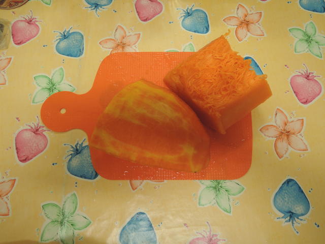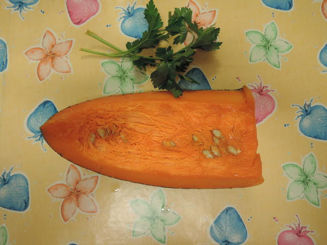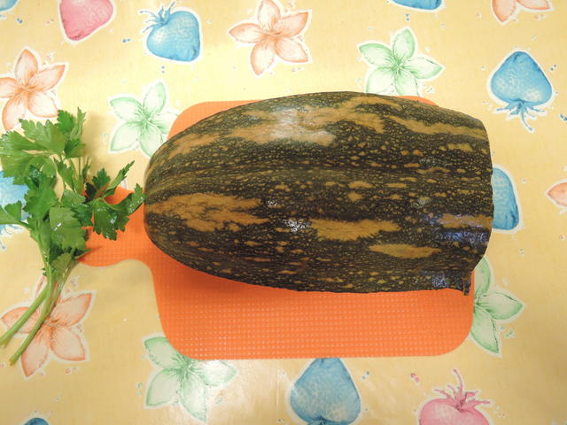 こちらがカボチャの裏側、イタリアのカボチャの皮は日本のかぼちゃの皮より硬くないので切りやすく調理しやすいです。