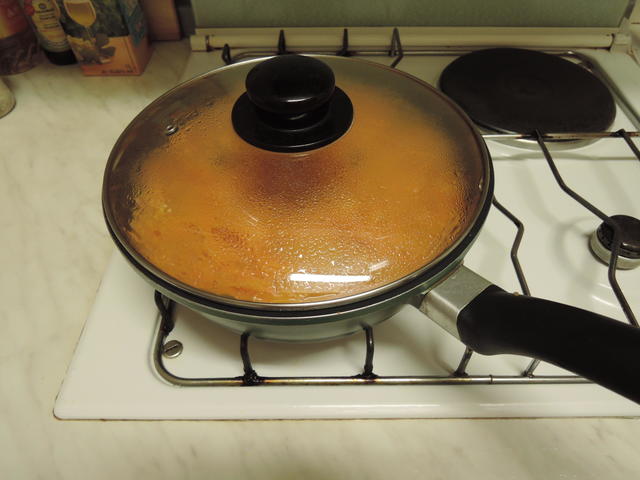 ワインを入れた直後は強火で、その後蓋をして弱火でコトコトとソースを作ります。