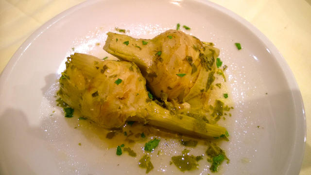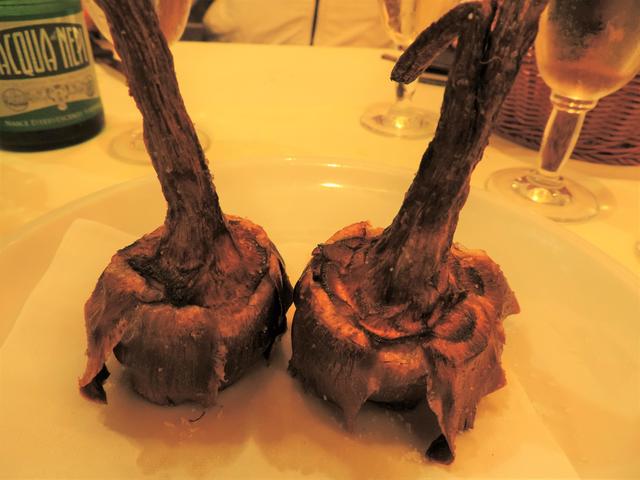 ↑ パスタからお肉・お魚料理、ピザまで当たり外れはありませんが、前菜からプリモ・ピアット(第一皿目)、お肉・お魚料理のセコンド・ピアット(第二皿目)、ピザ、ドルチェまでローマらしいものが揃っているので、ローマの名物を一つか二つ、選択されると良いかもしれません。写真はローマの代表的なお料理「アーティチョークのローマ風 “カルチョフィ・アッラ・ロマーナ(Carciofi alla Romana)”」です。アーティチョークの蕾の中にローマミントなどを詰めて、白ワインとオリーブオイルで蒸し煮にしたものです。