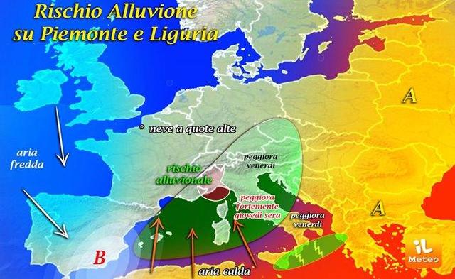 リグーリア州では特にジェノヴァから西へ行くほど大雨になり、ピエモンテ州ではトリノの北側付近で大雨注意!