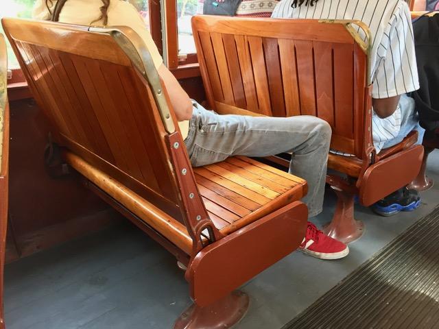 椅子が木製で背もたれがギシギシする。 これは進行方向が変わる時、背もたれを手で動かして向きを変えることができるようになっている。 運転席が乗客席より一段低くなっているというショーもない違いに気がついた。(車椅子の場合はどうなるのだろう?)