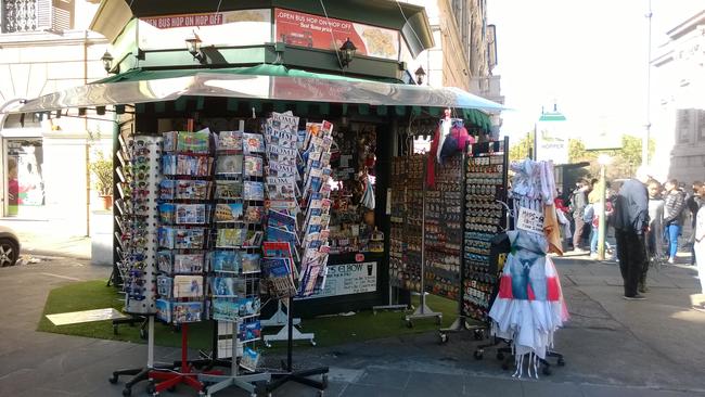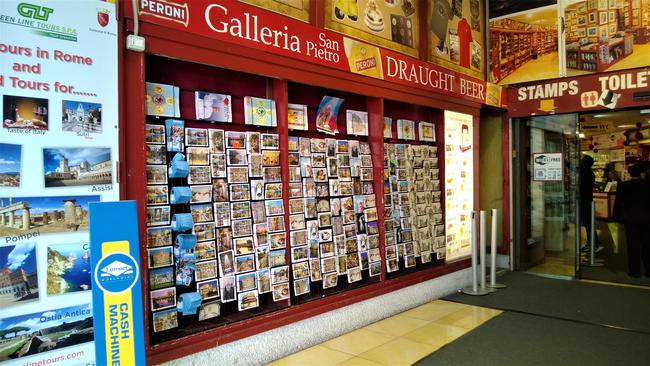 ↑ 絵ハガキなどはローマ市内の街角のキオスク(写真)やタバコ屋さんなどで購入し、全て記入後にこの場所でバチカン市国の切手を貼り、ポストに投函するという方法もあります。滞在中の時間がある時にホテルなどで書き溜めておくのも良いでしょう。ローマ市内では絵ハガキは1枚10セントから売られています。