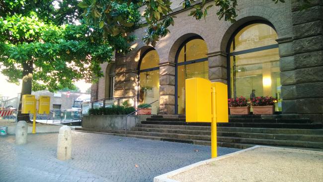 ↑ 郵便車です!向かって左側がエントラータ(エントランス)、右側がウシータ(エクジット)で出口です。黄色のポストが出口の階段の前にあります。