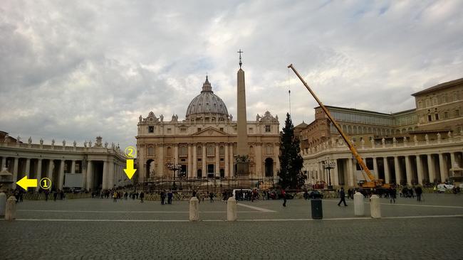 ↑ ここからが一般の方でも自由に手紙・ハガキを出せる場所のご案内です。バチカン市国では、一般の観光客が入れる場所は、主にサン・ピエトロ大聖堂、サン・ピエトロ広場、バチカン博物館に限られています。写真はサン・ピエトロ広場とサン・ピエトロ大聖堂です。ご覧の様に、先程、クレーンでクリスマスツリーが立てられたばかりです。次号で法王様のツリーの到着についてご案内します。