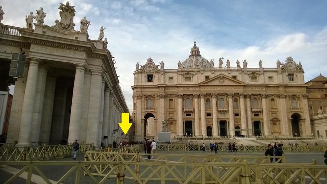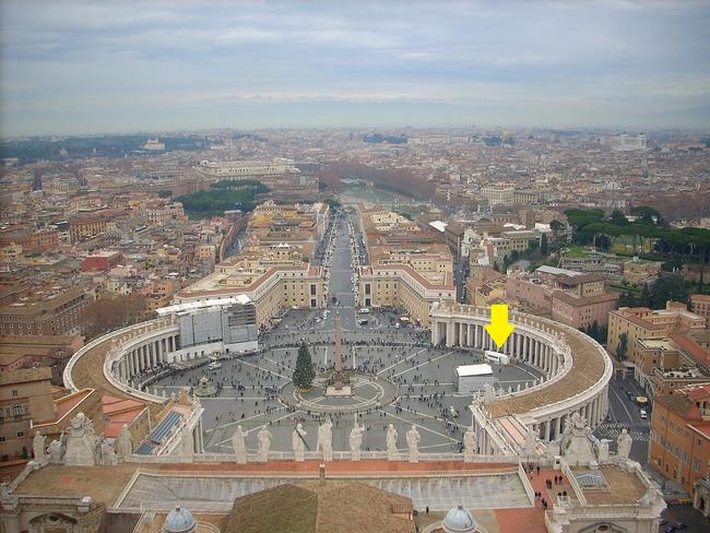 ↑ 位置関係が分かりやすい様に、この車を上から眺めてみましょう!郵便局の車は、バロックの巨匠、ベルニーニ設計の楕円形のサン・ピエトロ広場の284本並んだ円柱の近くにあります。サン・ピエトロ大聖堂のクーポラに上ると、展望台からローマ市内を360度眺めることが出来ます。正面は14区ボルゴ地区方面のパノラマです。