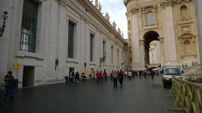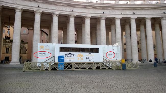 ↑ 1番の場所についてです。写真左側のこの白い車がバチカン郵便局です。内部で各種ハガキ、切手などを購入することが出来ます。郵便物は、車の出口前に立っている黄色のポストに投函する方式です。窓口の人によりますと、アメリカ、アフリカ、アジアへの絵ハガキ1枚の郵便料金(切手)は2.3ユーロです。(2016年11月24日現在の情報)