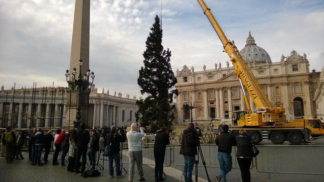 ↑ バチカン市国のサン・ピエトロ広場です。横になっていたモミの木が今クレーンで引っ張り上げられる所です。約10日前の11月13日に、東アルプスのラゴライ山脈の森で切り出された赤モミの木は高さは25メートル、重さは6トンあります。