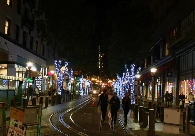 ケーブルカー・パウエル線の始発点 街路樹がライトアップされているのは知らなかった、灯台元暗しや。 乗車の列もなく昼間とは違った駅の様子。