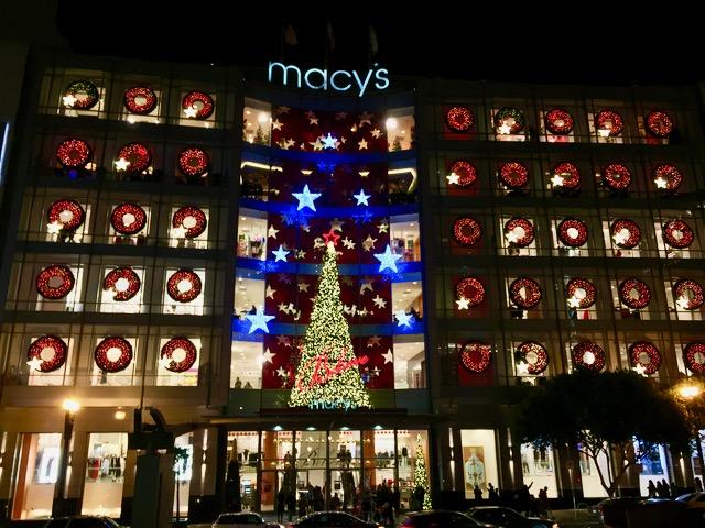 メイシーズ(Macy's)のイルミネーション見応えがあり "にわか写真家" が思い思いの角度でこの風景をカメラに収めていた。 ツリーを挟んでリースのライトをシンメトリーに写したいんだけど他のライトや障害物がいっぱいあって上手くいかないのだ。