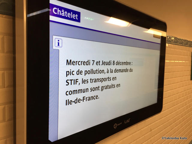 今月に入りパリは、自動車の排気ガスに由来するPM10を原因とする、大気汚染が起きています。特に深刻な日は、市内および近郊でナンバープレートに書かれた番号に沿った車やオートバイの交通規制を行なっており、同時に規制が行われる日は公共交通機関が無料になります。