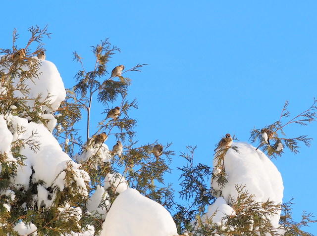 寒空の下ではありますが、数日ぶりの青空にスズメがたくさん日光浴をしています。
